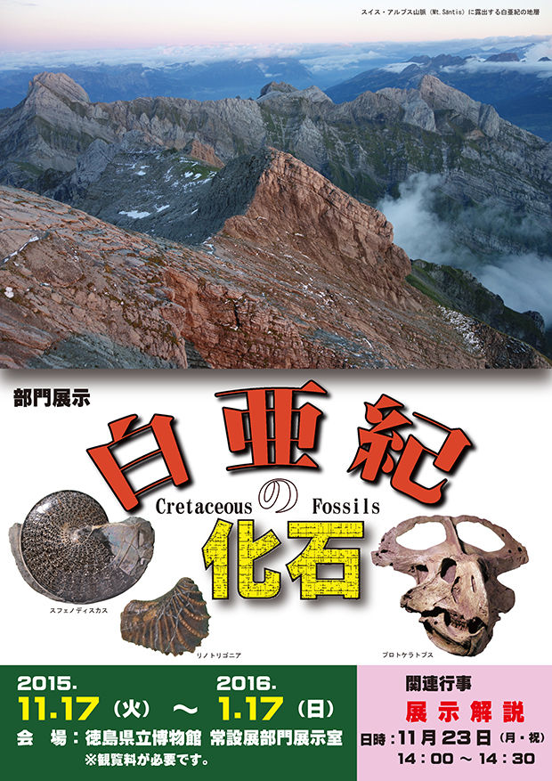 この展示では、徳島県内および国内外の白亜紀のさまざまな化石を紹介します。また、最近学術論文に発表された世界的に見ても珍しい形をしたS字状アンモナイト:プラビトセラスの顎器(現生イカ・タコ類のカラストンビに相当)の化石も、この展示会にて初公開します。